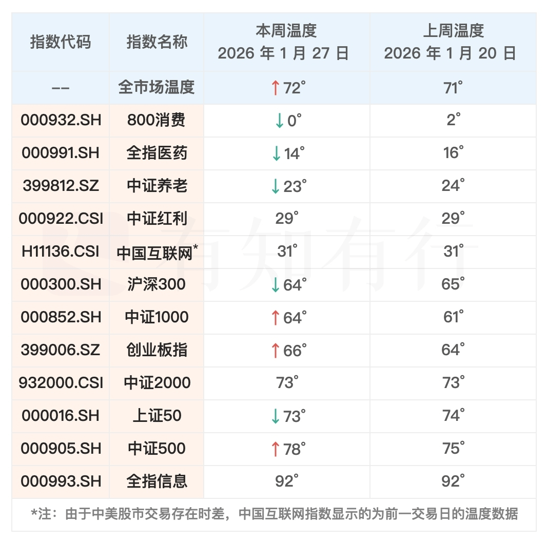 知行黑板报20260128期:长钱新买入资金的配置比例调整,从上周三到本周二,A 股整体上涨,中证全指上涨 1.27%,最新的全市场温度是 72°,与上周二相比,小幅提升。
